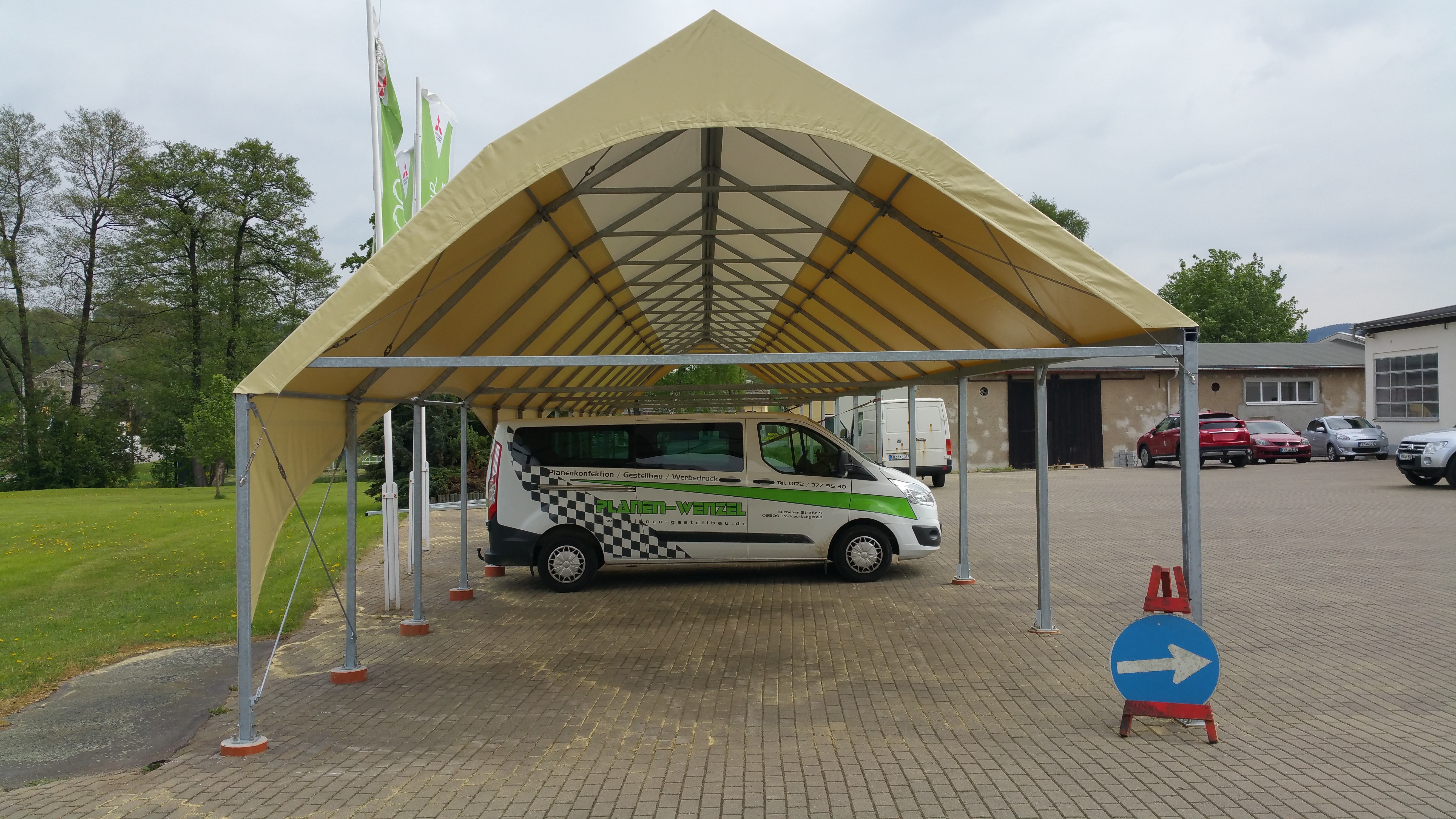 Die PVC-Plane ist wasserdicht, UV-beständig und widerstandsfähig gegen Temperaturschwankungen. Die Bogenform und die glatte PVC-Oberfläche unterstützen außerdem das Abgleiten von Schneelasten.
